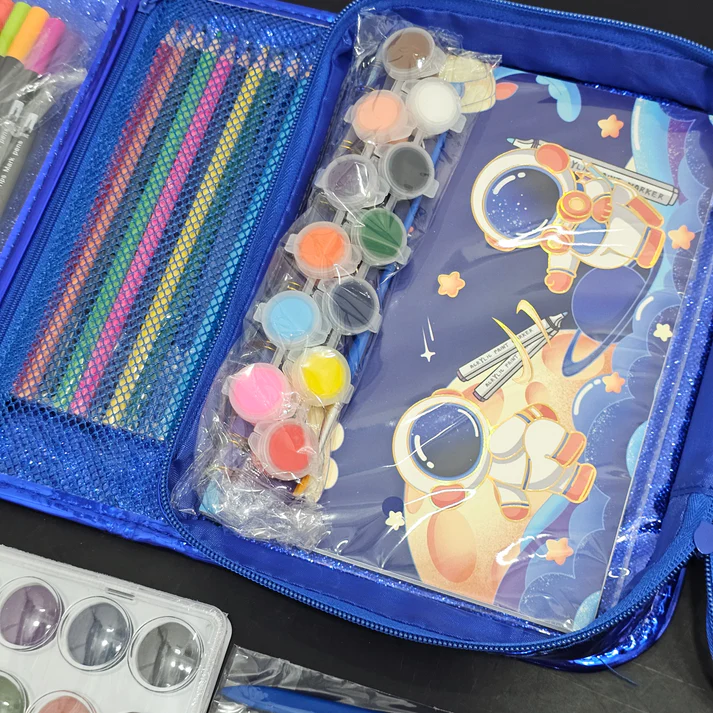 Complete 125-piece art kit with crayons, markers, pencils, glitter & more
