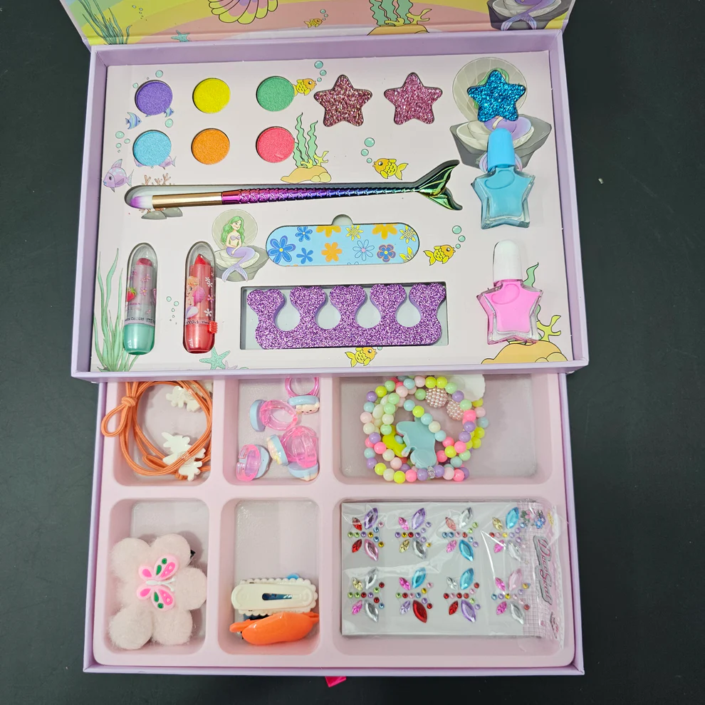 💄 2 in 1 Set – Includes a complete kids’ makeup kit and colorful fashion jewelry in one beautiful box